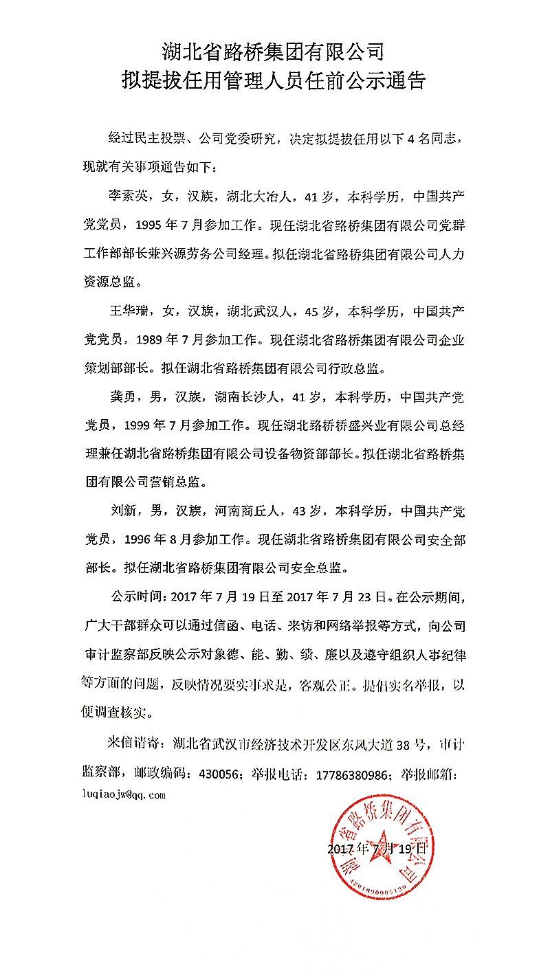 擬提拔任用管理人員任前公示通告
