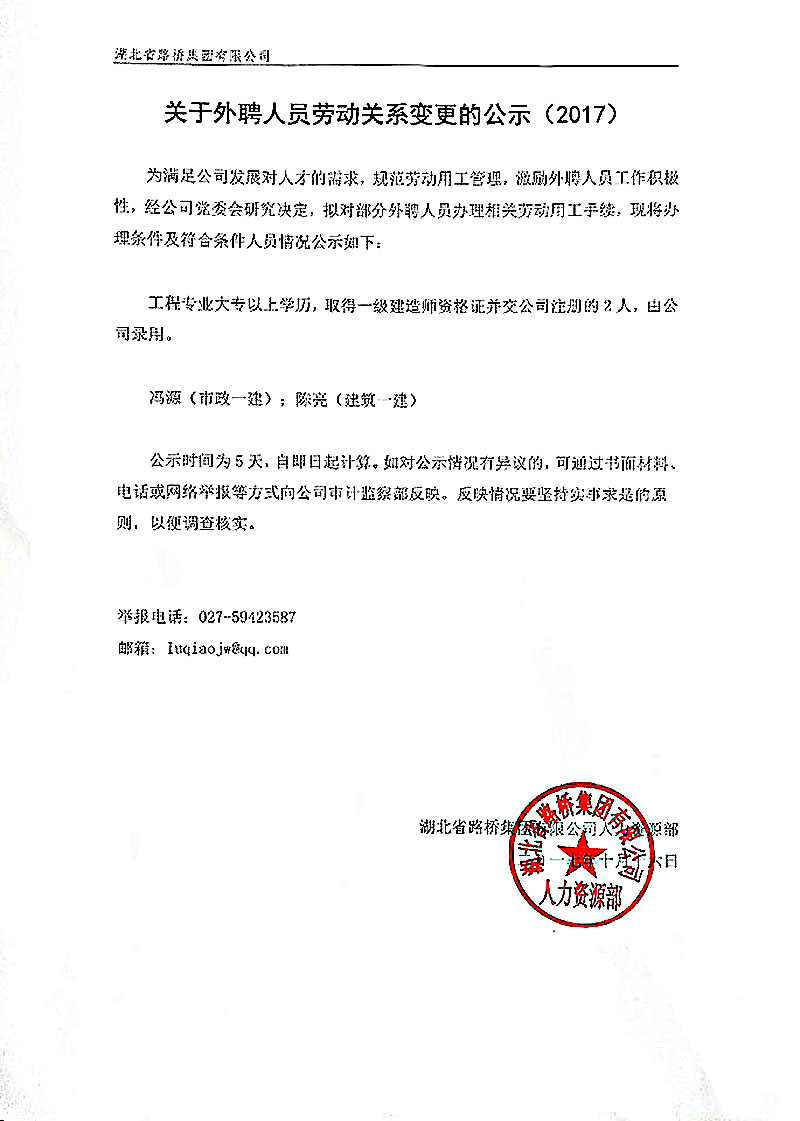 關(guān)于外聘人員勞動(dòng)關(guān)系變更的公示(2017)