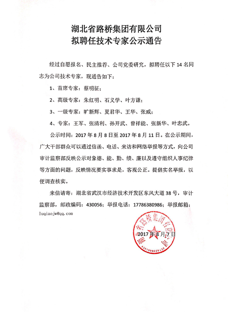 湖北省路橋集團(tuán)有限公司擬聘任技術(shù)專家公示公告