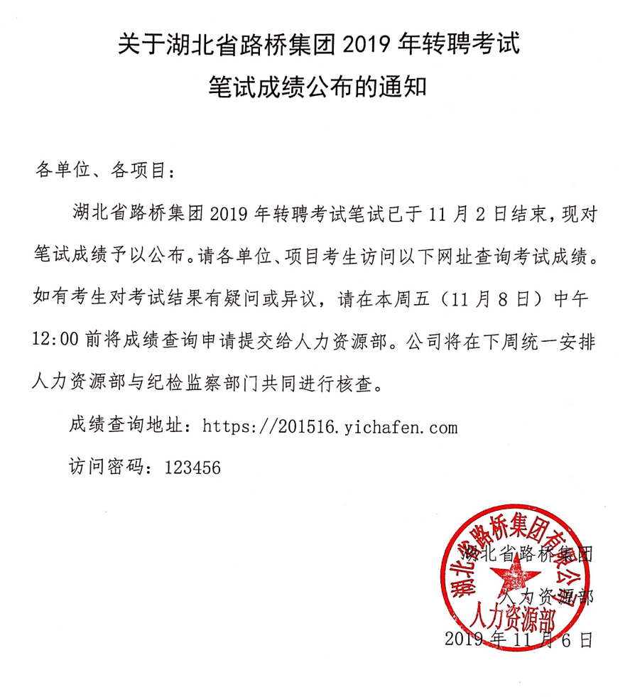關(guān)于湖北省路橋集團2019年轉(zhuǎn)聘考試筆試成績公布的通知