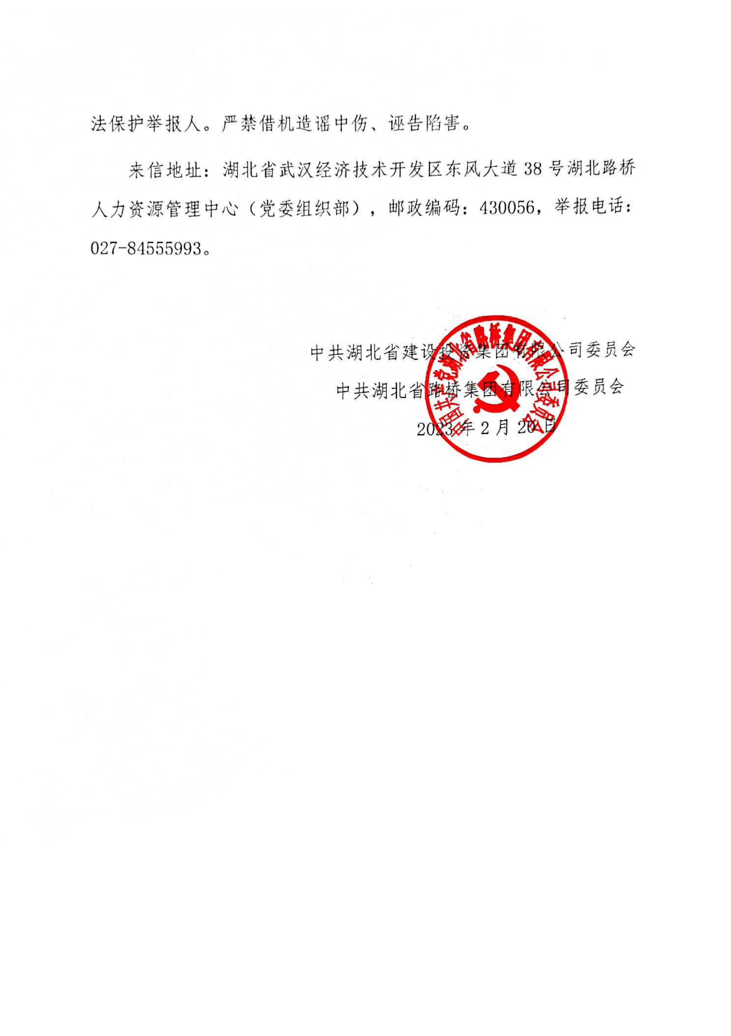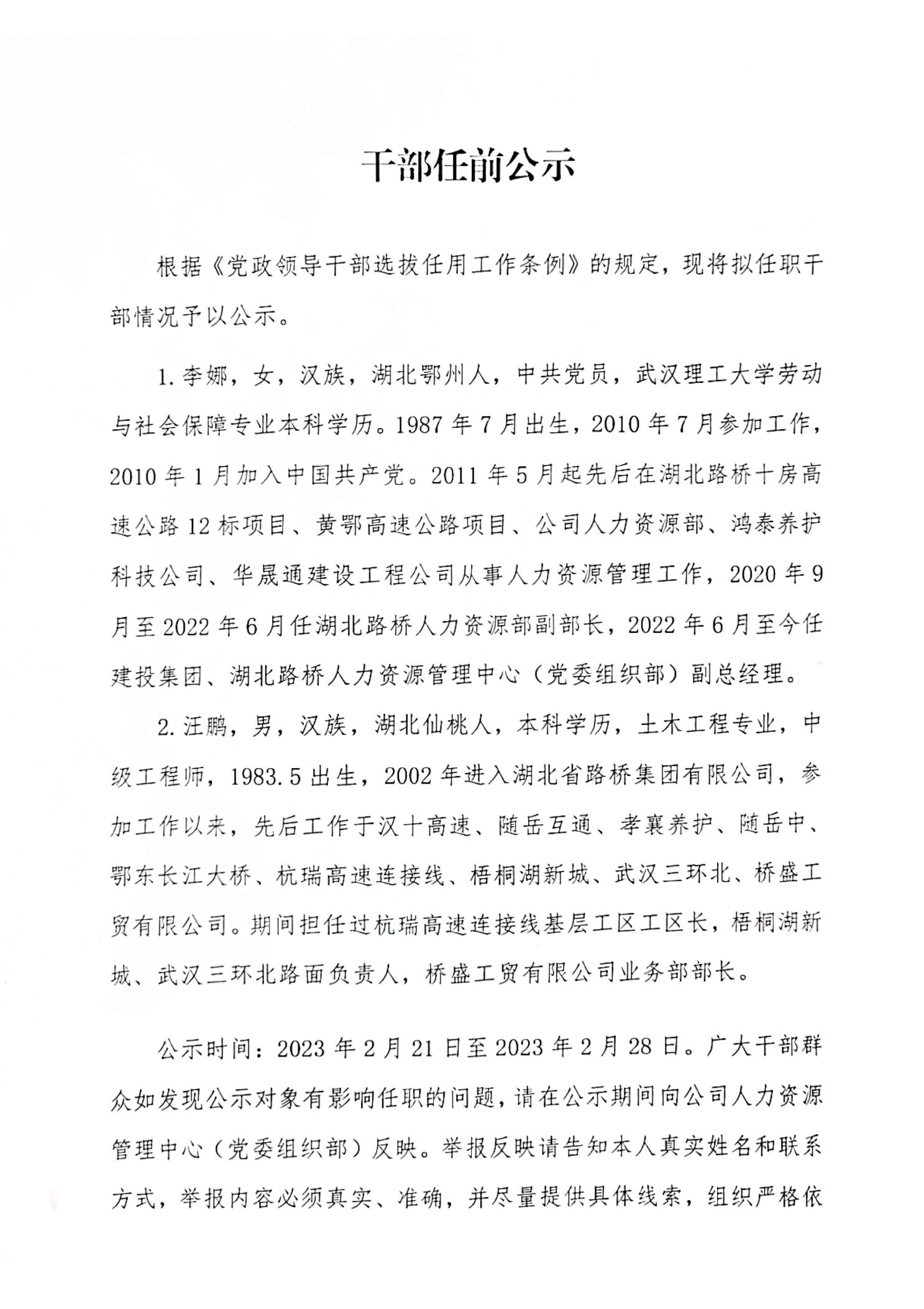 湖北省路橋集團(tuán)有限公司擬提拔任用管理人員任前公示