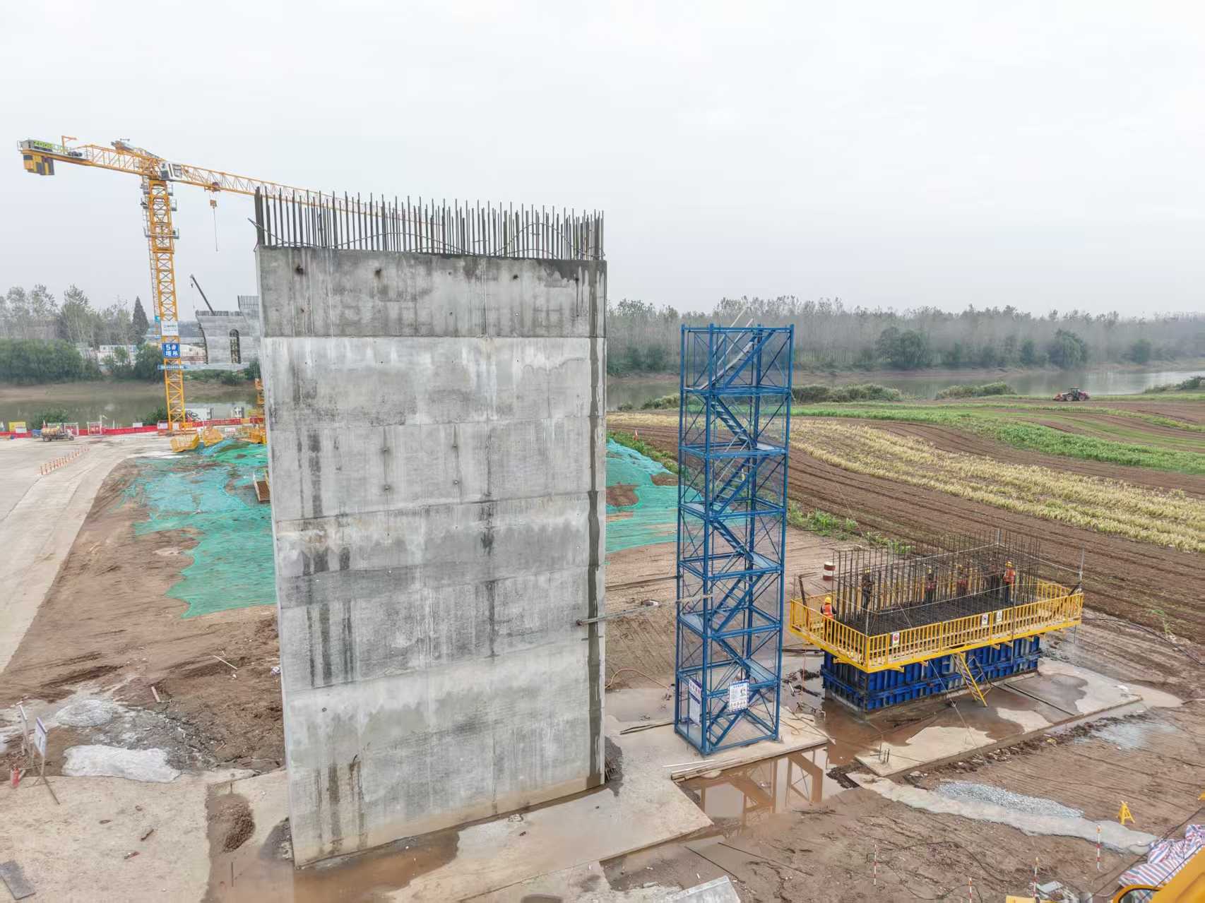 本次封頂?shù)?/span>4#過渡墩是連接松虎河引橋與主橋的關鍵墩位,采用分離式矩形實體墩設計,具有結(jié)構(gòu)穩(wěn)定、承載能力強的特點。墩身橫橋向?qū)?米、順橋向?qū)?.2米,采用C40高性能混凝土現(xiàn)澆工藝,澆筑方量達317.1立方米。為保障混凝土強度與耐久性,施工完成后立即啟動定時自動噴淋養(yǎng)生系統(tǒng),通過智能控制濕度與頻次,有效預防混凝土表面裂縫,確保墩身結(jié)構(gòu)質(zhì)量。